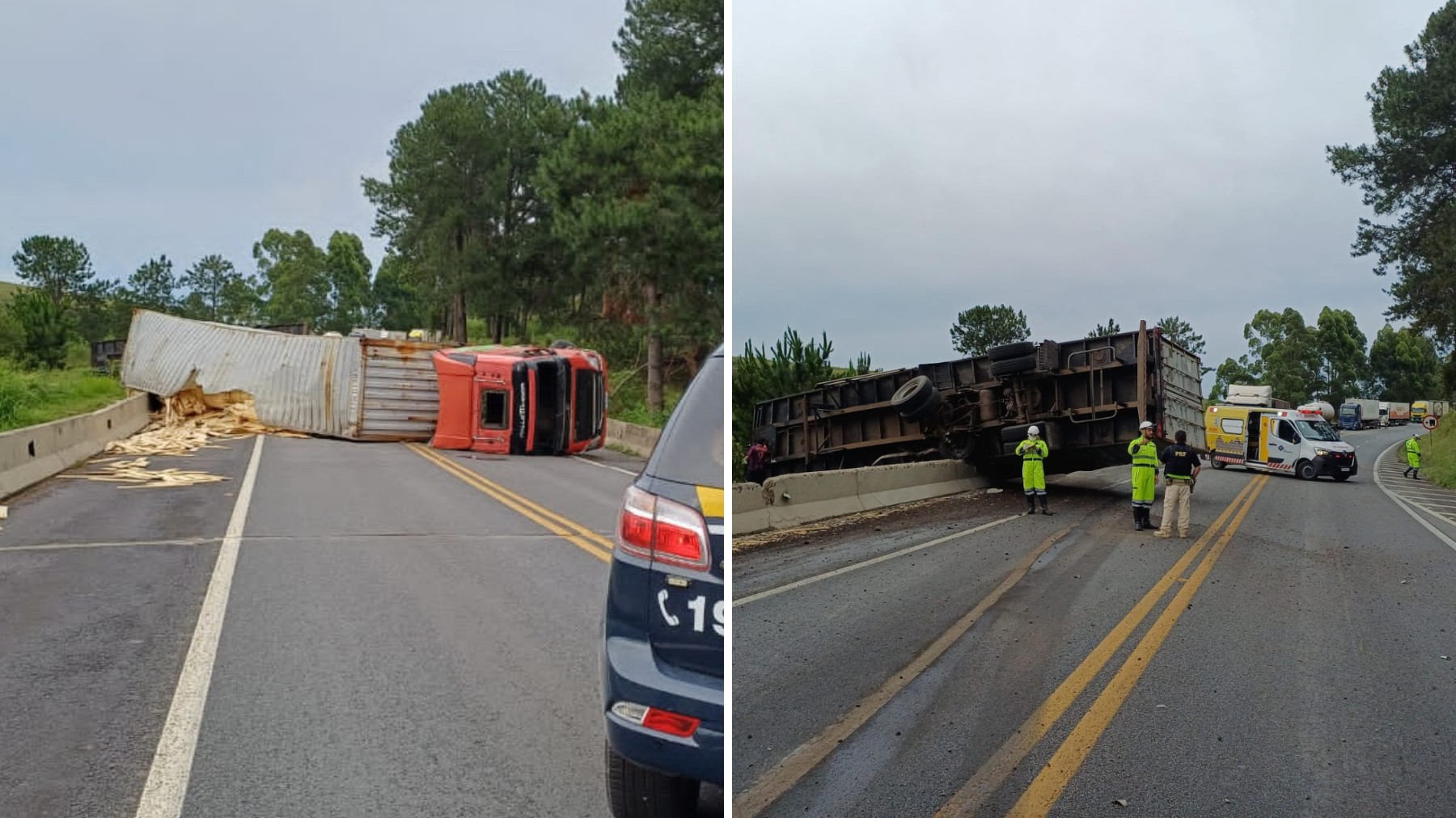 Caminhão bitrem tomba, semirreboque fica pendurado em ponte, e acidente no Paraná bloqueia BR-277; veja desvios